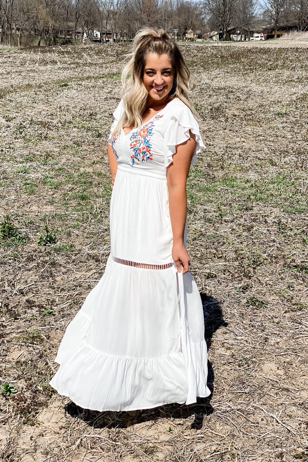 Stay Close To Me- White Dress w/ Embroidered Flowers