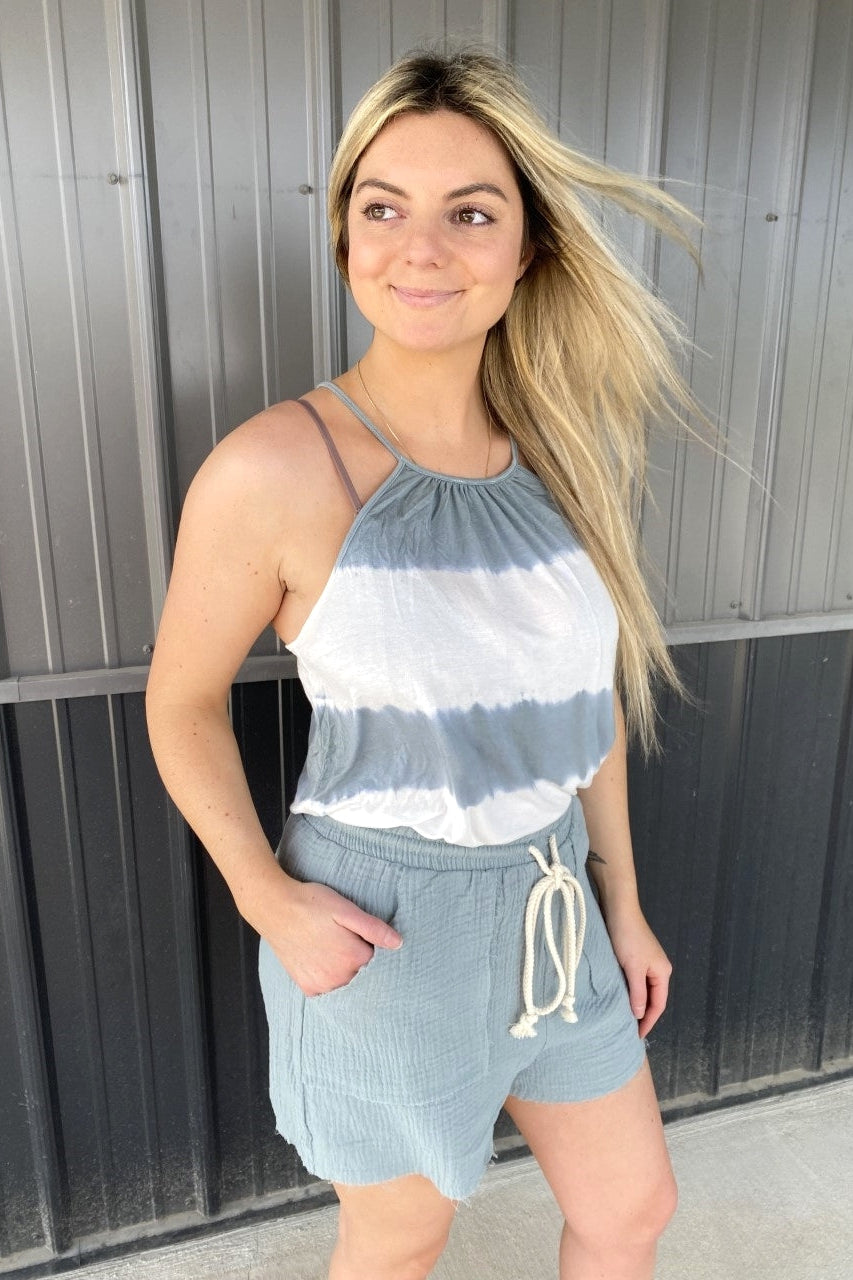 Sage & White Striped Tank w/ Crochet Detail