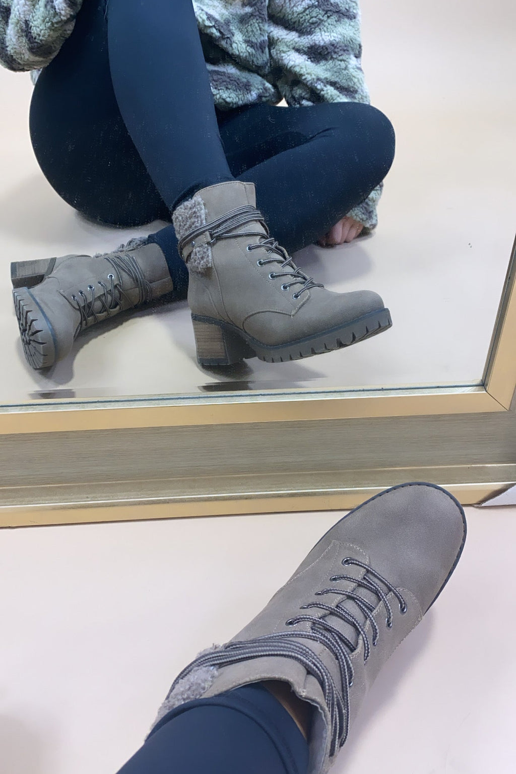 Wrapped Up- Taupe Brown Zip-Up Combat Booties w/ Sherpa Cuff