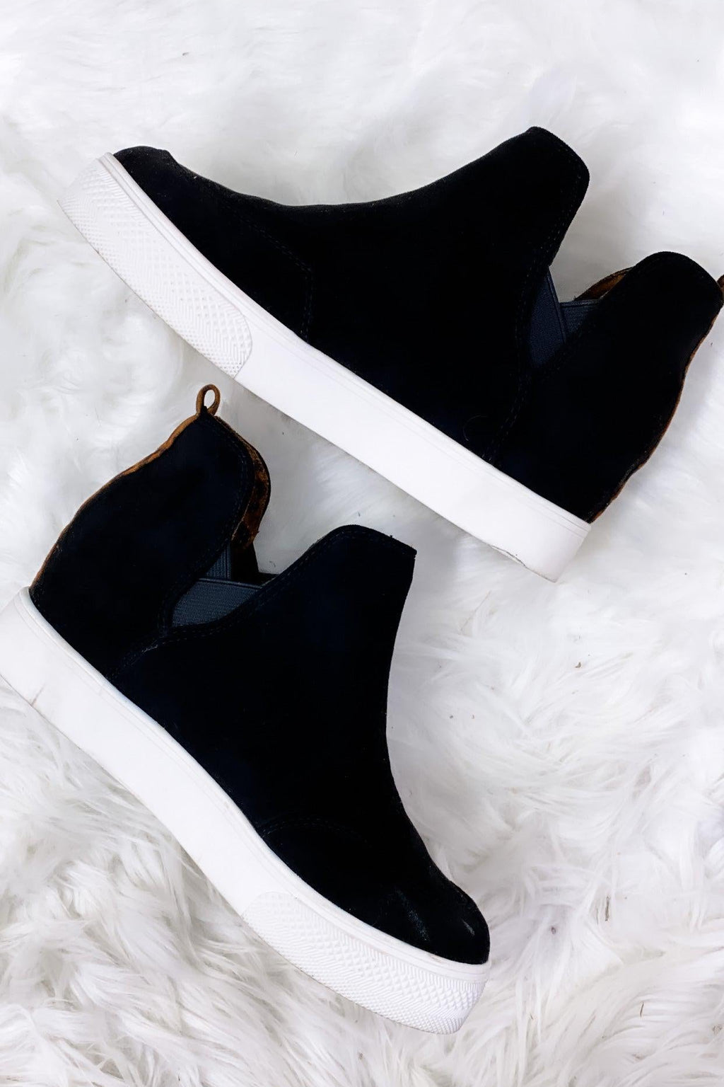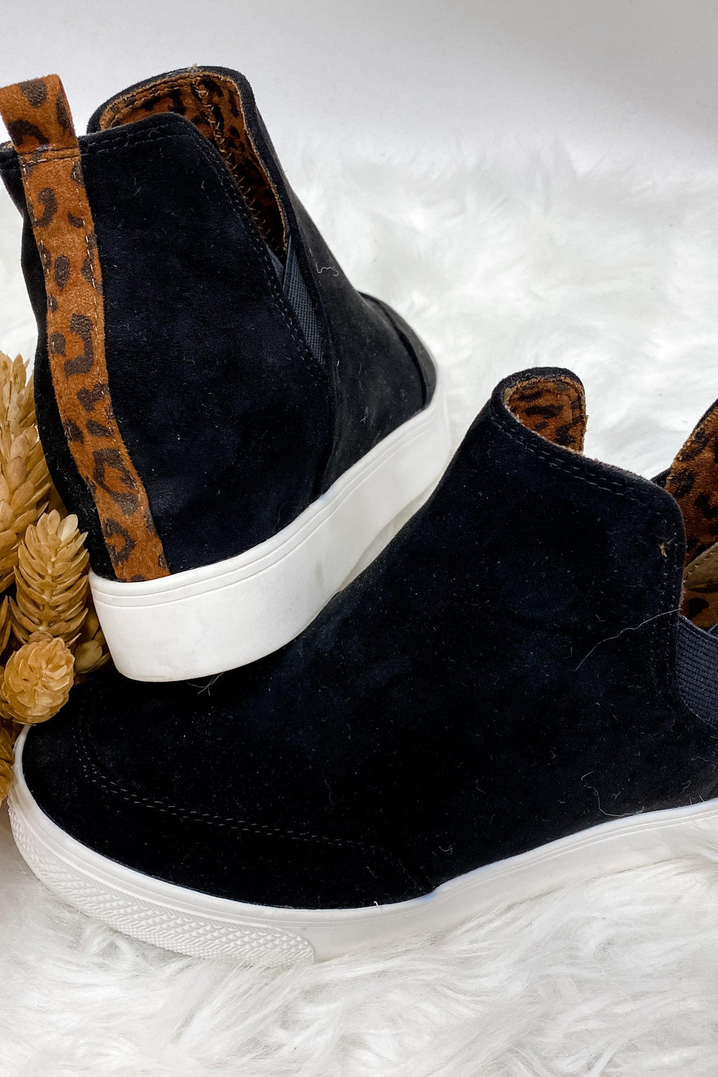 Can't Be Tamed- Black Wedge Sneakers w/ Leopard Detail