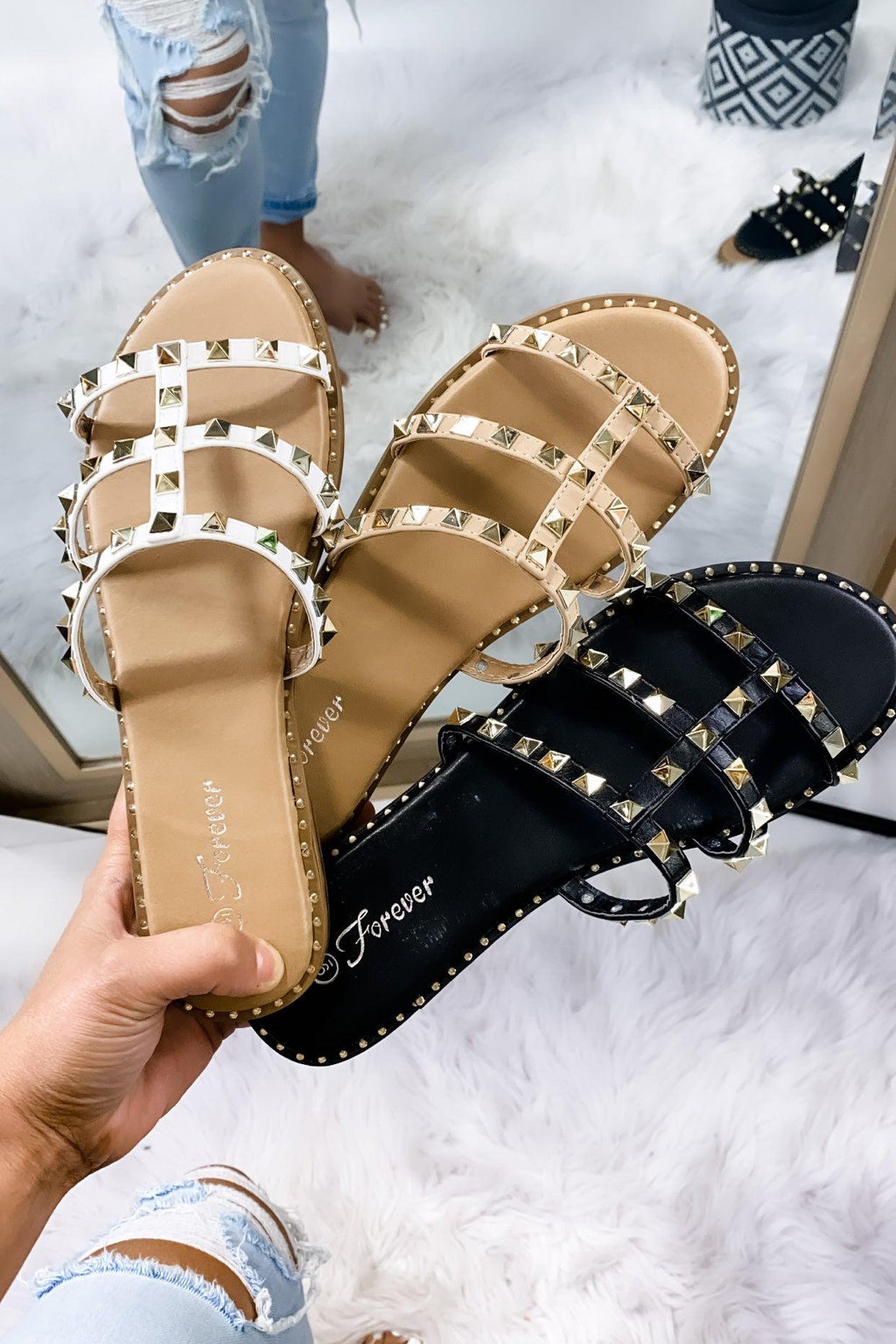 Eyes On The Prize- {Taupe, White & Black} Sandals w/ Gold Studs
