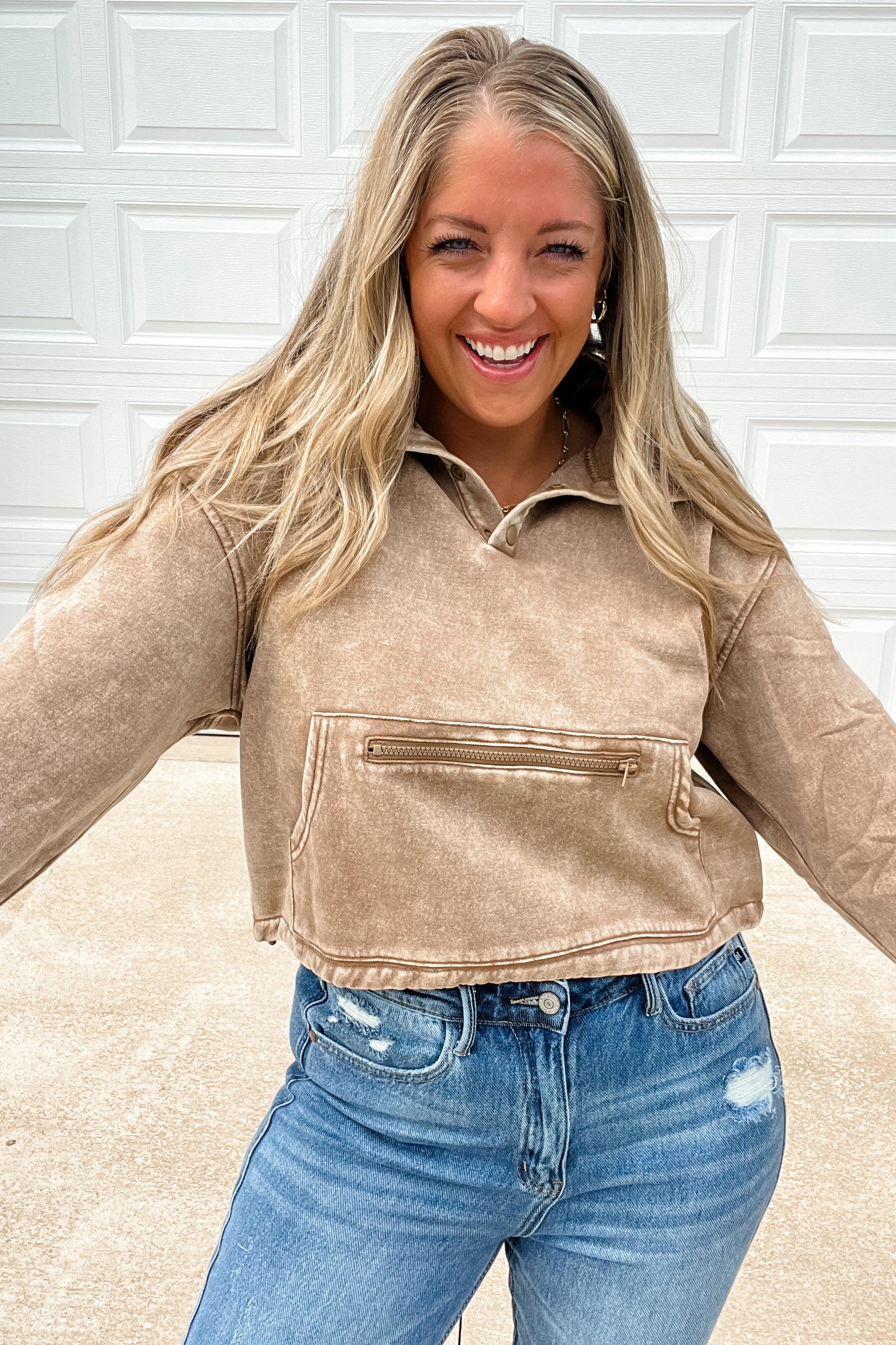 The perfect mix of laid-back + functional! This pullover features a soft washed finish for that effortlessly worn-in vibe and a roomy front zip pocket to stash your essentials (phone, keys, lip gloss—you name it 😉). With its cropped fit and neutral sand tone, it’s an easy throw-on piece that goes with literally everything.