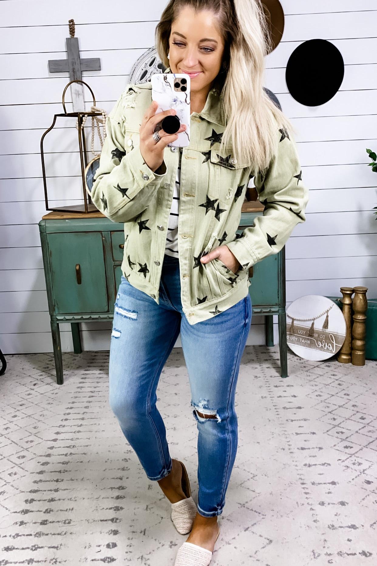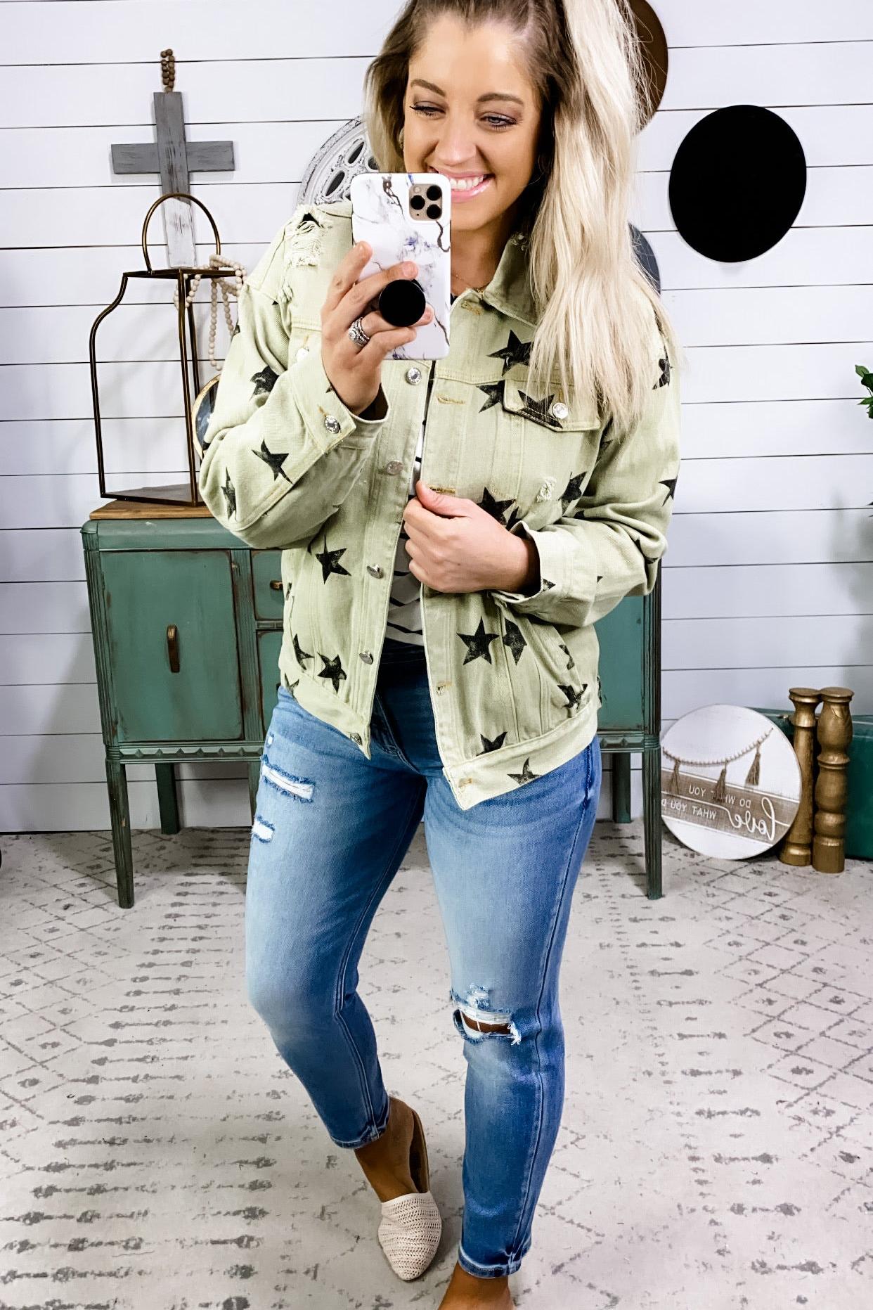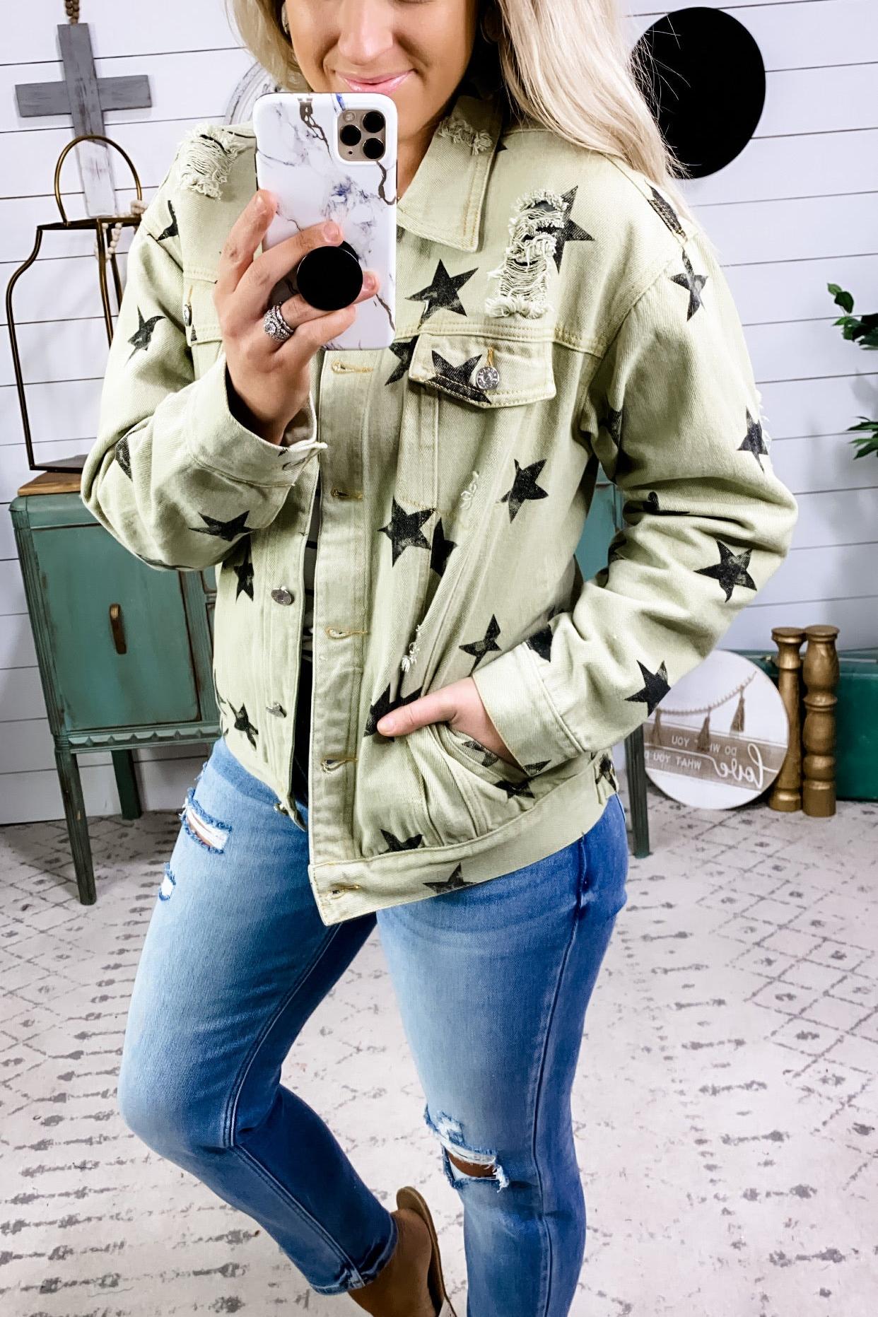 Wake me if I am dreaming, but I think I am seeing stars🤩 This jacket is so DREAMY and will be the perfect choice for effortlessly taking your look up a notch. We are loving the olive color with the faded black star detail throughout. This will 100% be your new favorite layering piece. Jacket features functional button closures, minimal distressing throughout, mustard stitching, and functional pockets